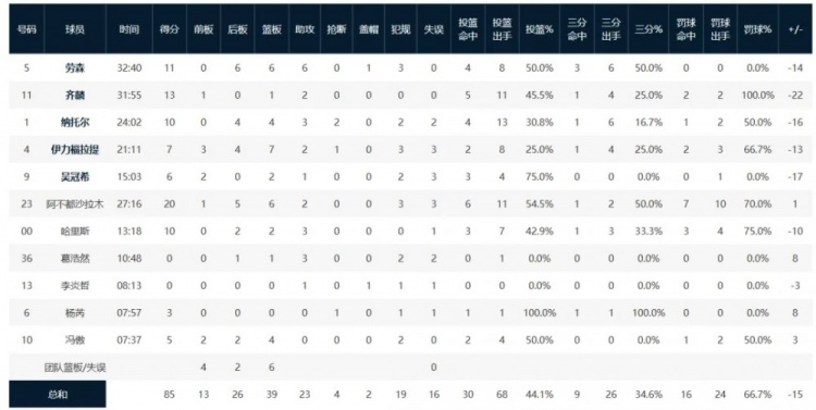 數(shù)據(jù)統(tǒng)計:沙拉木20分6籃板2助攻,齊麟13分2助攻,勞森11分6籃板6助攻,哈里斯10分2籃板3助攻,納托爾10分4籃板3助攻2搶斷,伊力福拉提7分7籃板2助攻,吳冠希6分2籃板,馮傲5分4籃板,楊芮3分,葛浩然3助攻。