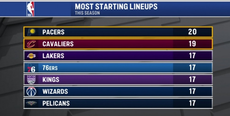 本賽季至今使用最多套不同首發(fā)陣容的球隊(duì):步行者20套 騎士19套