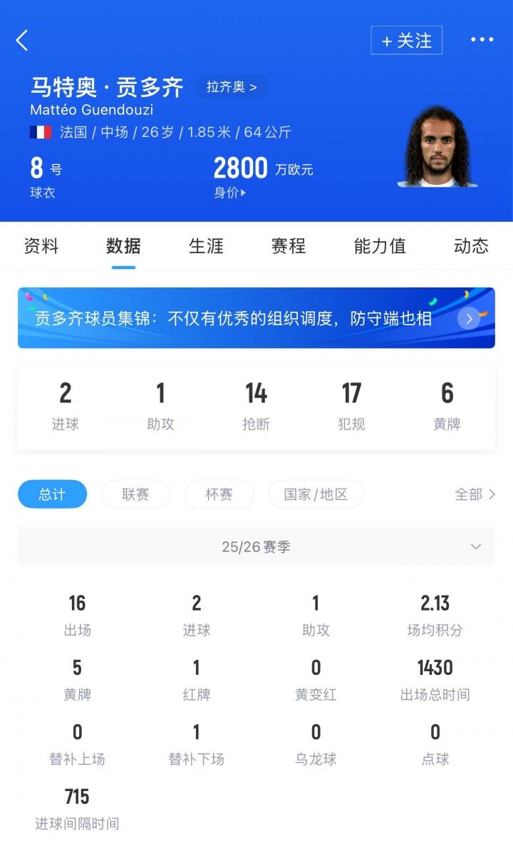貢多齊現(xiàn)年26歲,切轉(zhuǎn)司職中場,馬諾盟費德轉(zhuǎn)身價2800萬歐。歲貢貢多齊本賽季為拉齊奧出場16次貢獻2球1助攻。多齊