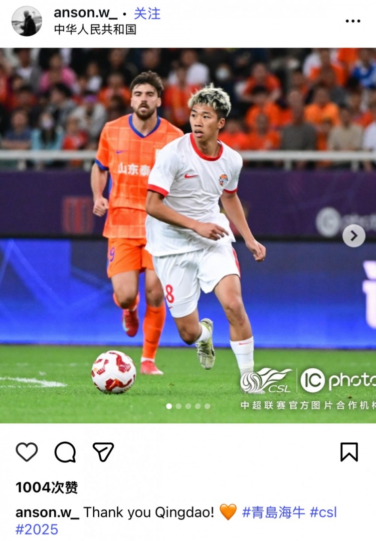 黃皓雋在社媒曬出了2025賽季效力青島海牛的香港多張照片,并正式向俱樂部和球迷道別。籍球