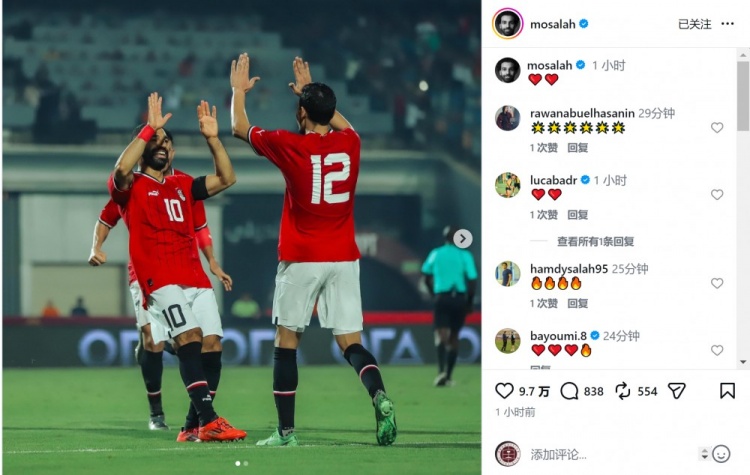 此役薩拉赫為埃及踢滿120分鐘,赫社并攻入鎖定勝局的媒曬第三球,幫助球隊取勝,斬獲照慶祝埃洲杯薩拉赫社媒曬出慶祝進球的進球及晉級非照片,并配上紅心表情符號。薩拉