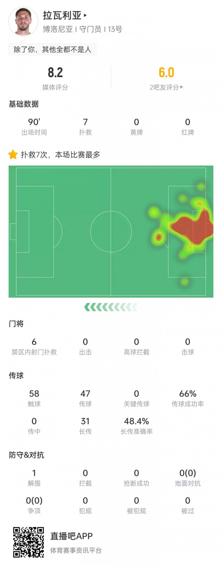 盡力了!博洛尼亞門將拉瓦利亞數(shù)據(jù):7次撲救難挽敗局,獲評(píng)8.2分