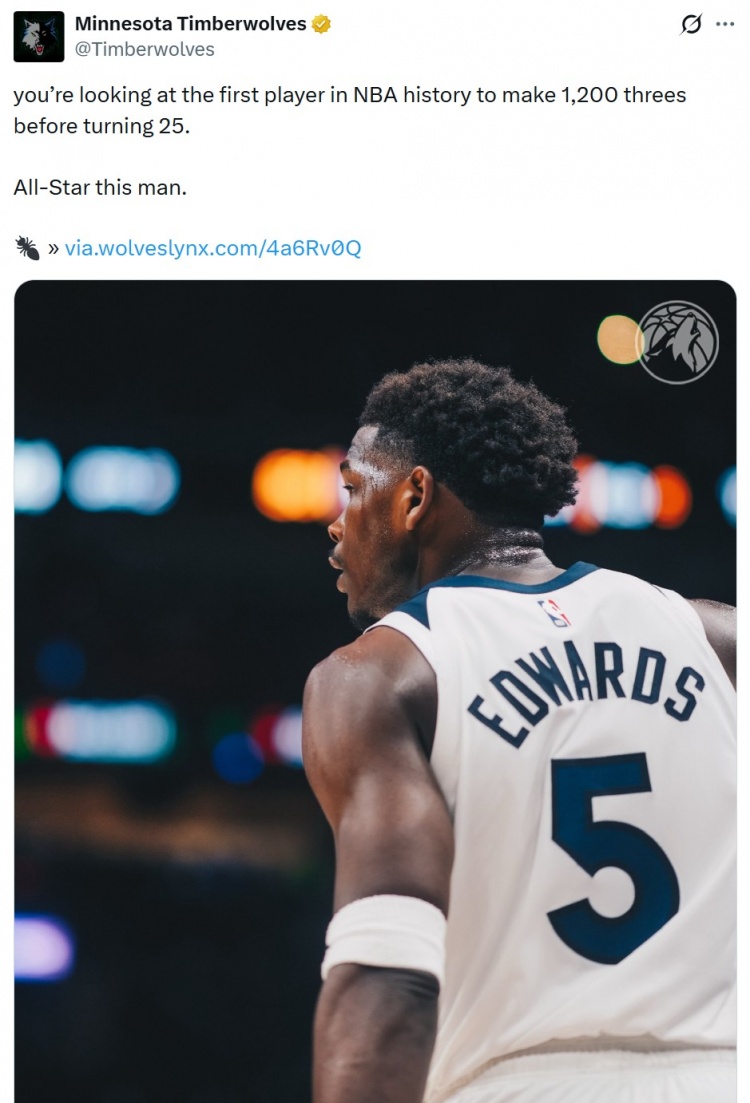 森林狼官推鬧烏龍!愛德華茲生涯三分命中數(shù)為1199 還未破1200+