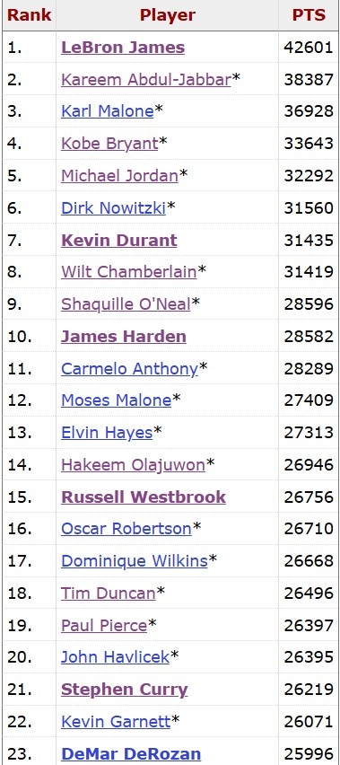 德羅贊常規(guī)賽生涯總得分突破26000大關(guān),分里NBA歷史第23人,程碑次詹現(xiàn)役第六人,歷史僅次于詹姆斯、現(xiàn)役杜蘭特、威庫哈登、德羅第人第僅杜登威少、贊迎庫里。生涯