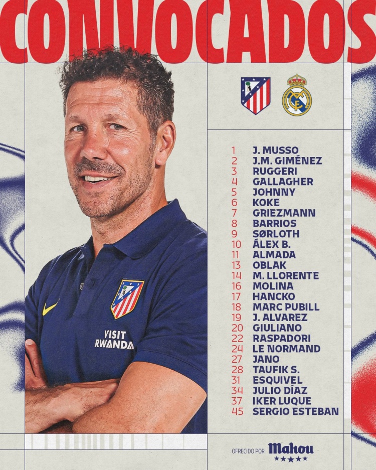 馬競西超杯對陣皇馬名單:阿爾瓦雷斯、格列茲曼、科克領(lǐng)銜