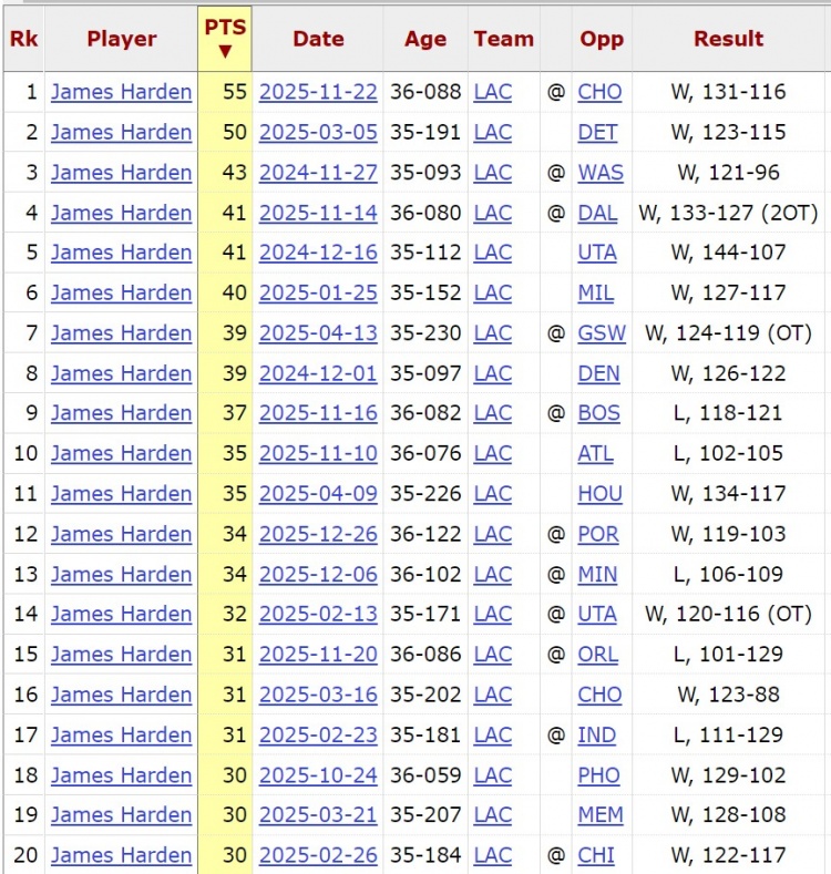 作為09雙雄之一,哈登正在征戰(zhàn)個人第17個賽季,今年他已經(jīng)36歲。在35歲之后,大胡子已經(jīng)20次砍下30+,去年11月,他在對陣黃蜂的比賽中砍下55分,這是快船隊史單場得分紀(jì)錄。