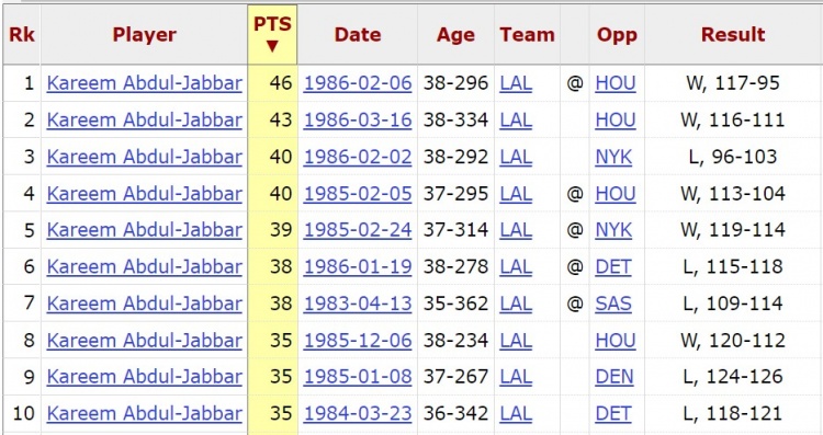 賈巴爾在NBA征戰(zhàn)20個賽季,35歲之后他48次砍下30+,其中包括4場40+。
