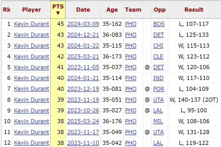 KD已經(jīng)37歲,在35歲之后58次砍下30+,其中包括7場40+。