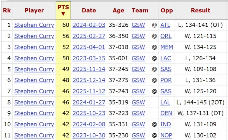 庫里是09屆另一位代表人物,曾經(jīng)的小學(xué)生如今已經(jīng)37歲,在35歲之后,庫里已經(jīng)66次砍下30+,其中,在2024年2月對陣?yán)销椀谋荣愔?,他瘋狂砍?0分。