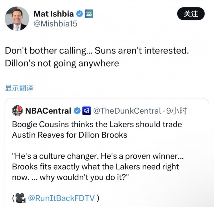 伊什比亞通過社媒X轉(zhuǎn)發(fā)考辛斯的太陽太陽節(jié)目言論回應道:“不必費心打電話了……太陽對此不感興趣。狄龍哪兒也不會去。老板”