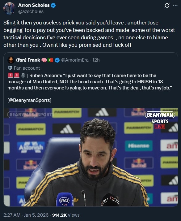 直播吧1月5日訊 曼聯(lián)名宿斯科爾斯的大兒子阿隆·斯科爾斯今天在推特發(fā)文,怒噴曼聯(lián)主教練阿莫林。在曼聯(lián)和利茲聯(lián)的比賽后,阿莫林在發(fā)布會(huì)上表示:“我只想說我來曼聯(lián)是來當(dāng)經(jīng)理manager)而不是教練coa