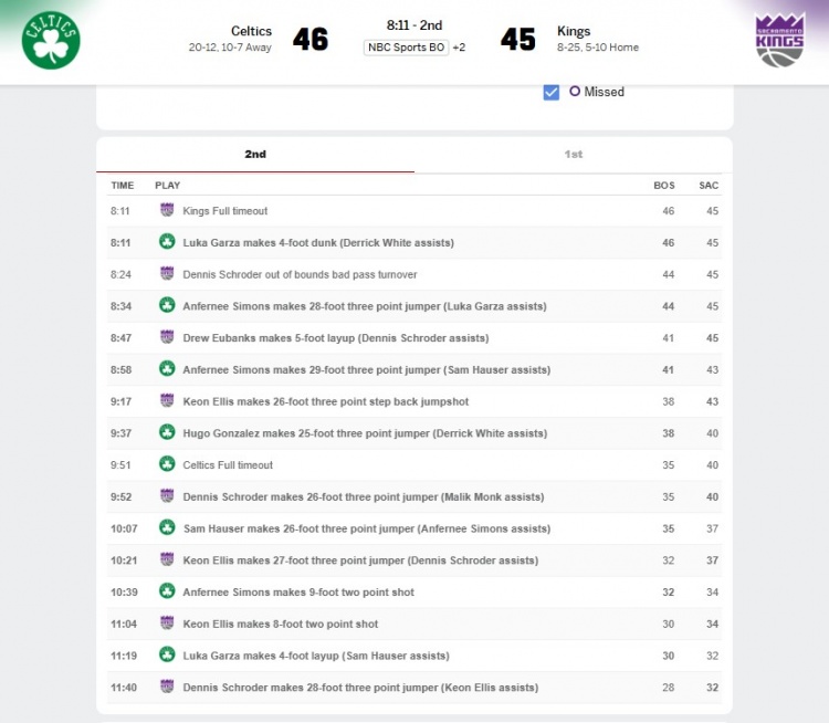 對飚上了!凱爾特人&國王第二節(jié)上來合計前15投全中 一個沒丟
