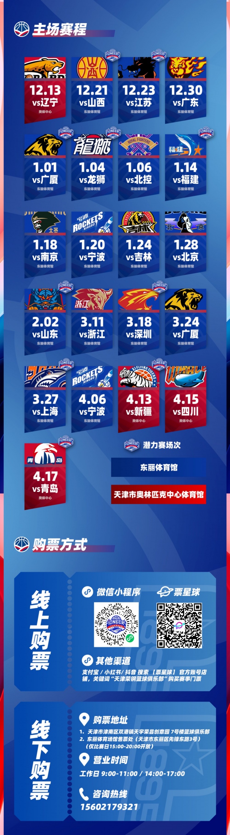 票務|天津對陣福建、同曦、寧波場次球票 1月7日 9:58 準時開售