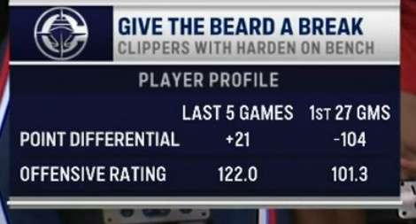 哈登下場休息 快船近5戰(zhàn)凈勝分+21&進(jìn)攻效率122.0分
