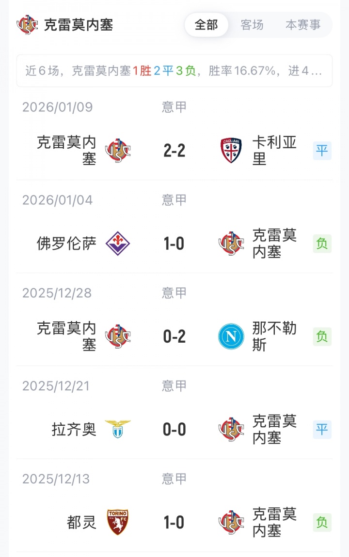 克雷莫內(nèi)塞首發(fā):1-奧代羅、6-巴斯奇羅托、24-泰拉恰諾、15-比安切蒂、7-澤爾賓、3-佩澤拉、33-格拉西、38-邦多、11-約翰森、90-博納佐利、10-瓦爾迪