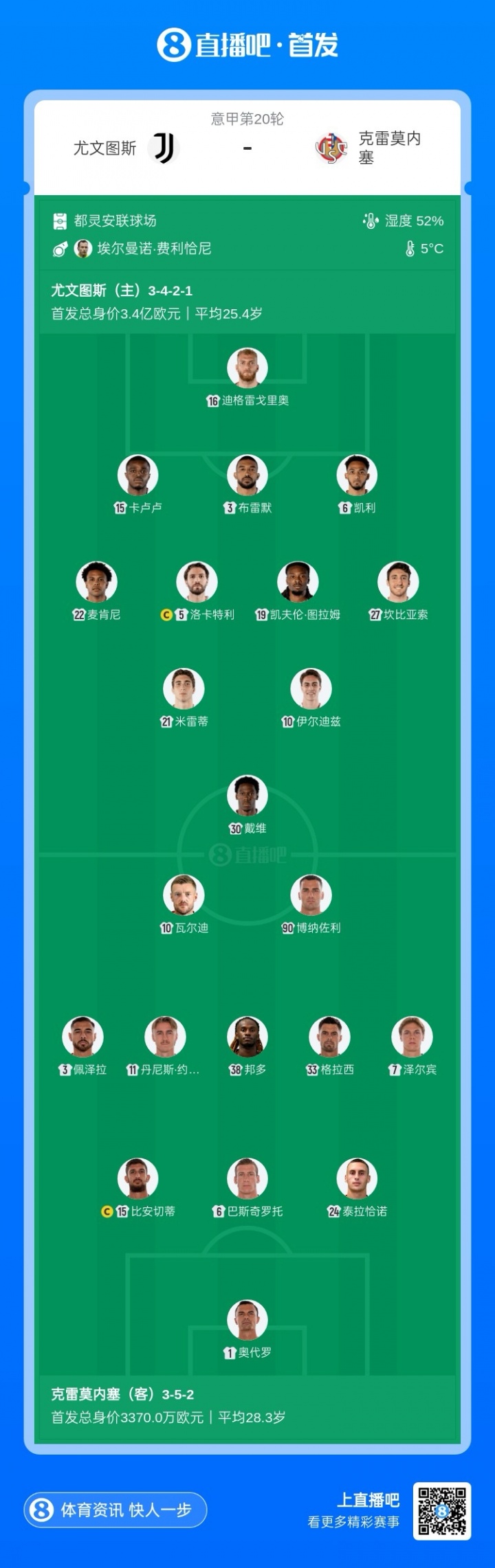 直播吧1月13日訊 意甲第20輪,尤文伊尤文圖斯主場迎戰(zhàn)克雷莫內(nèi)塞,克雷賽前首發(fā)名單公布。莫內(nèi)